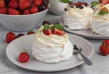 Preheat oven to 225˚F. Line large baking sheet with parchment paper. Using stand mixer, beat 6 egg whites on high for 1 minute until soft peaks form. With mixer on, gradually add 11/2 cups sugar; beat 10 minutes on high, or until glossy, stiff peaks form. With spatula quickly fold in 1/2 tablespoon lemon juice and 1/2 tablespoon vanilla extract; then fold in 2 teaspoons corn starch; mix until well blended. Using a Wilton 1M tip, pipe meringue into 3- to 31/2-inch wide nests onto parchment. Indent center with spoon. Bake at 225˚ for 1 hour and 15 minutes — do not open oven door while baking. Turn oven off and keep door closed another 30 minutes. Outsides will be dry and crisp to the tap and a pale cream color; insides will still be marshmallow soft. Transfer pavlova, still on parchment paper, onto counter or rack; cool completely. Beat cold whipping cream with 2 tablespoons sugar in cold bowl for 2 to 21/2 minutes until whipped. Pipe cream onto pavlova and top with fresh fruit. Garnish with fresh mint, chocolate shavings, chopped hazelnuts. Enjoy!