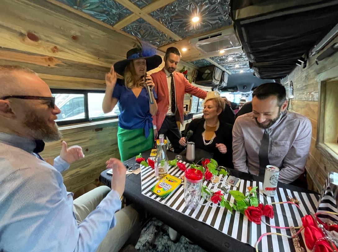 project catering only to friends and family—he quickly recognized the inherent potential to make a living doing something he loved. Then it was just a matter of honing the business model and transforming his Mercedes Sprinter Van into the “Northwest Chariot” it is now–trimmed out with locally-sourced blue pine siding, climate control, dimmable lighting, USB ports for phones, storage for purchases, a socially engaging seating arrangement, and of course, a full karaoke system!