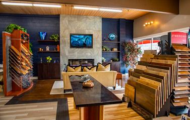 As you continue through the showroom, you will find all your flooring needs from custom stained hardwoods to engineered flooring, as well as luxury vinyl plank and tile. We also feature custom closets in a variety of styles as well as carpeting to go along with your master bedroom. Relax on the couch in front of the built-in fireplace on a 12-foot wall of tile with a built in TV. Every aspect of our showroom is designed with the idea of vision and craftsmanship. Check out our stairs as we have a variety of cable systems, iron balusters and glass, as well.