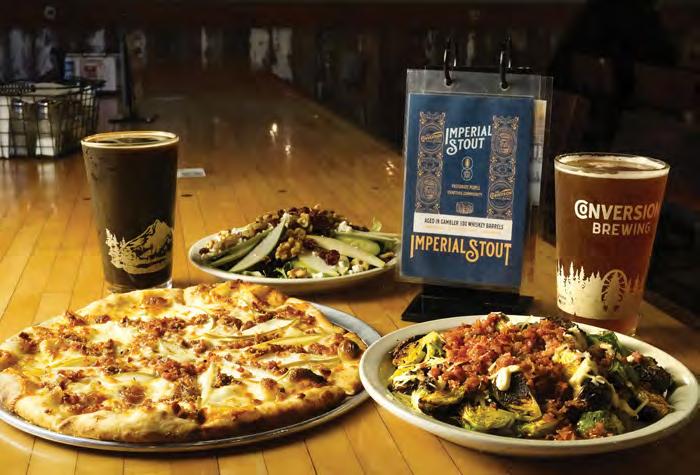 our spent grains. It’s a great partnership — we like to say, ‘Drink a beer, feed a cow,’” Matt says with a laugh. Dessert is cheesecake or the Dutch Apple Pizza, made with freshly baked apples and cinnamon and topped with a decadent Dutch crumble.