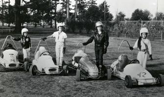 — a cousin of the Cadonau boys — being mechanically-minded, came up with the idea of a quarter-midget racing track. It wasn’t long before the idea became a reality, and child-sized race cars were zooming around a track a quarter-mile in length, set in a natural bowl shaped area with seating for up to 500 spectators. In addition to the midget racing track, a velodrome facility was added in 1967 for bicycle racing. Carl Cadonau Sr. was sold the idea by the owner of Kissler’s Cyclery, a longtime bicycle shop in Southwest Portland. At the time the Pan American games needed a location for cycling trials. The Alpenrose Velodrome was one of the first constructed in the U.S. for that purpose, and with the steepest bank of any outdoor velodrome in the world, it drew enthusiasts from around the globe.