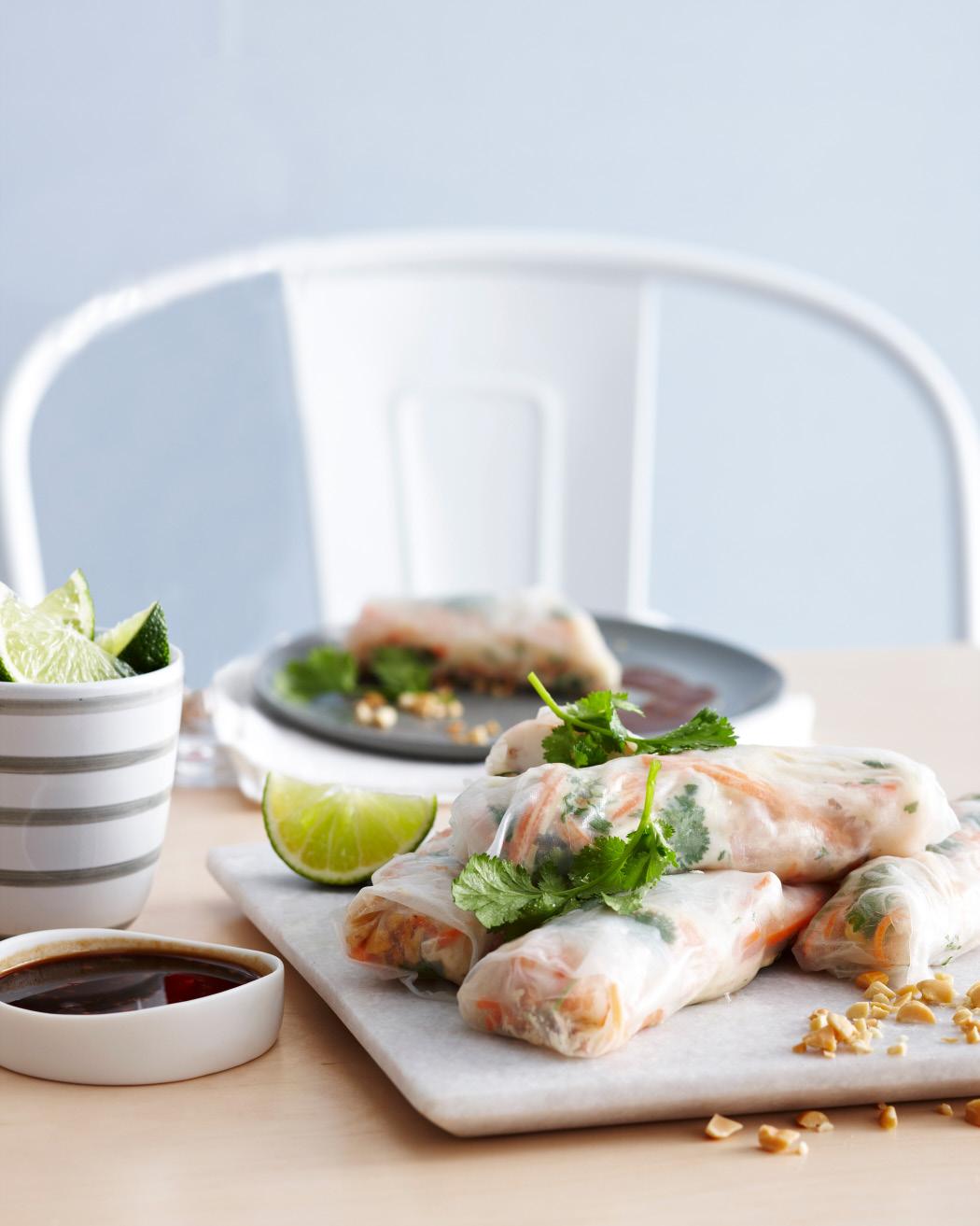 Roll the rice paper similar to a burrito by folding in the sides then rolling forward. The rice paper is naturally sticky, so you might need to wet your fingertips while folding.
