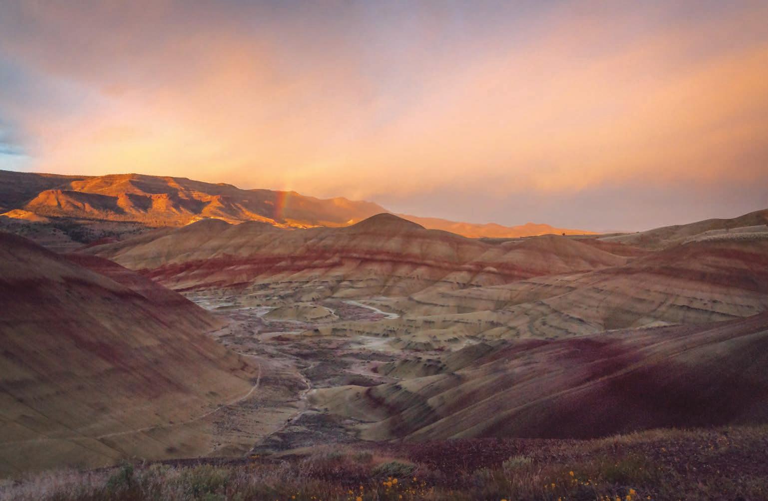 I went back to my vigil wondering if it was going to be a photographic loss, but still feeling grateful that I was there no matter the weather conditions. Just before sunset I was watching the western horizon with my attention completely 180 degrees away from the hills. I was noticing a thin opening in the clouds just above the horizon. As I watched the clouds it started to rain again. I crossed my fingers to help increase my luck. With my attention off the Painted Hills, I watched as the sun came into the opening in the clouds projecting the most beautiful orange light onto the clouds in front and above me. I started taking photos but felt disappointment that the light show appeared to be in the wrong darned place.