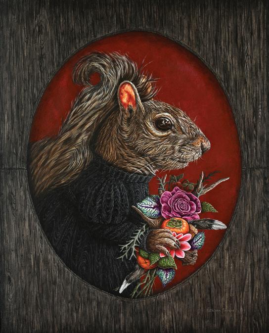 Through her highly-detailed and gorgeously-rendered acrylic illustrations, renowned local artist Kathleen Powers whisks us away into an enchanting world. Often casting herself metaphorically as the feathered and furry subjects of her works, she also writes original fables to accompany each piece. Read at the viewer’s discretion, these delightful passages offer a unique and profound glimpse into the mind of the artist. Interpretation is still, of course, left up to the individual, but for those seeking insight into “what the artist was trying to say,” there are answers to be gleaned. Whether one chooses to follow Kathleen down the rabbit hole, or discover a path of their own, viewing her art is a uniquely-engaging experience that is not to be missed.