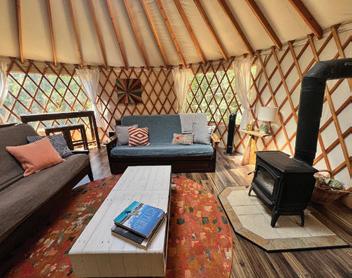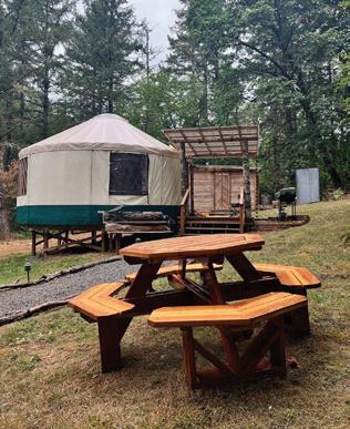 or vista tent, both nestled in secluded clearings amidst the forested hills. The yurt sleeps four people and features a full kitchen and flush toilet with an outdoor fire pit perfect for roasting marshmallows. The vista tent sleeps two and provides a comfortable full-size bed, a weatherproof kitchen with a barbecue, phenomenal views and a fantastic opportunity for nighttime stargazing. Both sites are available for booking on AirBnB and Hipcamp. Visitors are encouraged to hike the beautiful trails, explore the surrounding wine country and schedule a guided truffle tour for a fun and unique experience hunting Oregon truffles!