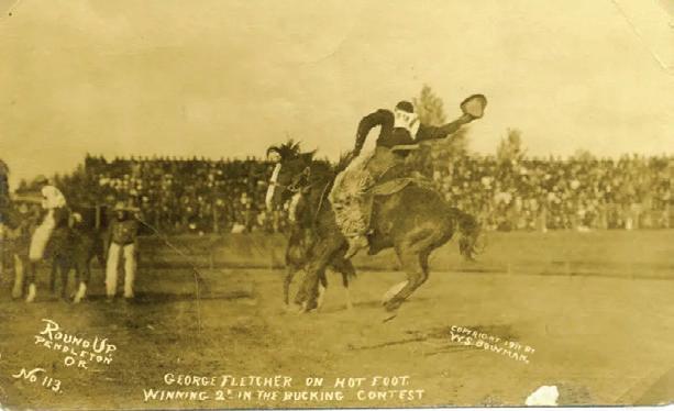 George Fletcher’s rodeo career lasted only a few more years. While serving abroad during World War I, he sustained a leg injury that ended his competitive bronc riding days. He continued to work as a cowboy the rest of his life, however, and in 1972 he was named an inaugural member of the Pendleton Round-Up and Happy Canyon Hall of Fame. Fletcher died the next year and was buried in Pendleton.