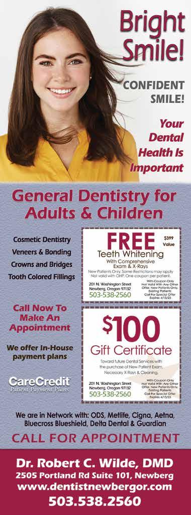 Call Today 503-852-5443 1384 N.E. Hwy 99W • McMinnville • McMinnvilleGas.com McMinnville Gas Inc. P R O P A N E GAS C O M P A N Y FREE TANK RENT For An Entire Year With The Purchase Of More Than 500 Gallons Of Propane Gas In A Year. Propane Sales, Service & Delivery Residential & Commercial Installation & Maintenance The Best Deal on Propane! Office: Davida Brenden, Susan Eder, Ro Paxton Owners: John Buller & Ryan Buller Family Owned & Serving the Willamette Valley Since 1946 Commercial Valid for new customers only. Expires 2/15/23 $100 OFF FIRST TANK FILL New Customers Only Valid for new customers only. Expires 4/15/23 Chehalem Insurance Associates Personalized Insurance Plans To Meet Your Needs So That Every Day Is A Sunny Day! Call Today For Your F R E E C O N S U LTAT I O N (503) 852-5045 211 North Meridian Street, Ste 103, Newberg Medicare Insurance Retirement Planning Life Insurance Health Insurance Specializing in: Om T. Sukheenai Founder & Broker 8 To Advertise With Us, Call 503.825.2111