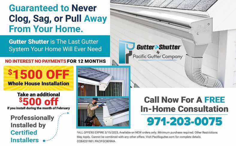 BEFORE AFTER ROOF REPAIR ROOF REPLACEMENT GUTTERS GUTTER GUARDS SKYLIGHTS ATTIC INSULATION $500 ANY FULL ROOF REPLACEMENT PROJECT. Restrictions apply. Call for details. Coupons must be presented and redeemed at time of sale. Cannot be combined with any other offer. Expires 4/15/23 OFF $200 ANY AIR SEALING & INSULATION PACKAGE Cannot be combined with any other offer. Not valid for prior work, must be presented and redeemed at time of estimate. Expires 4/15/23. OFF Josh Lowe OWNER ROOFING! 503-683-8282 KRSofOregonMag.com CCB #231578 IT’S NOT RIGHT! It’s wasting your money every month and making your home uncomfortable. If your ATTIC looks like this… THIS IS RIGHT! WHY WAIT? It pays for itself! And it’s what’s underneath that makes your whole house WARMER in winter and COOLER in summer. Call us for a free estimate and find out what it is! CCB #176741 Contact us for a FREE ESTIMATE 503-744-5004 DrEnergySaverPNW.com A NEW ROOF FOR AS LITTLE AS $175 A MONTH!* *Based on $15,000 Reroof