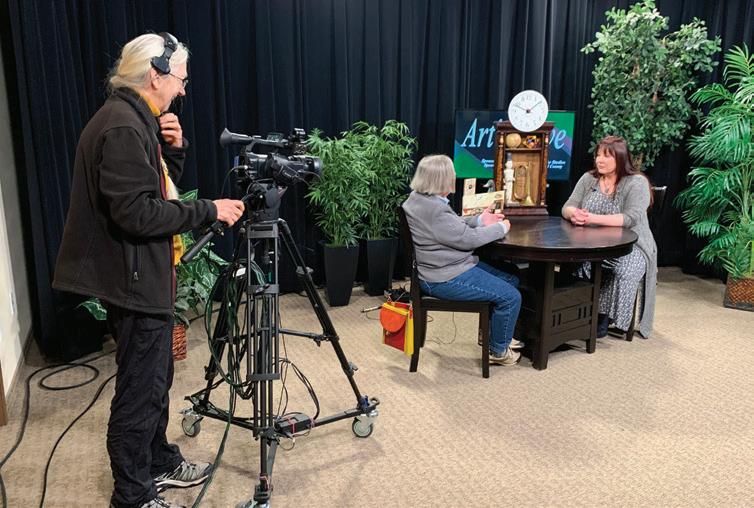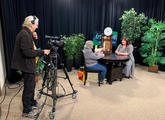 ABOVE: Mike Santone runs the control board during a taping of “Arts Alive.” TOP LEFT: Elizabeth Santone (left) prepares for a taping of the MCM TV program “Arts Alive” hosted by Lynda Phillippi (right) in an episode, featuring local clockmaker Ann Durley.