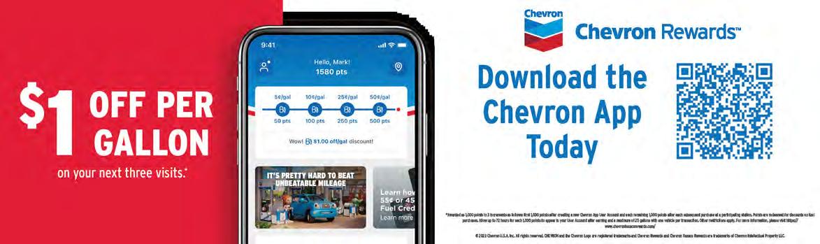 Touchless Car Wash On Site! Save 20¢ PER GALLON ON GAS WITH WITH SUPER, DELUXE OR ULTIMATE CARWASH Offer valid for a limited time and subject to change without notice. Not valid with any other offer or discounts. Both gas and car wash have to be purchased in one single transaction either outside at the pumps or inside the store. No Coupon Required. SAVE AT THE PUMP SAVE AT THE PUMP SAVE ON CAR WASH SAVE ON PURCHASE SAVE AT THE PUMP SAVE AT THE PUMP SAVE ON CAR WASH SAVE ON PURCHASE SAVE AT THE PUMP SAVE ON PROPANE SAVE AT THE PUMP SAVE ON PROPANE SAVE $100 Any Fill Up! MINIMUM FILL UP 8 GALLONS Not valid with any other offer or promotion.Valid only at listed Chevron location. Must present coupon at Chevron Food Mart. Expires 12/15/23 SAVE $150 Gasoline/Diesel MINIMUM FILL UP 10 GALLONS With Cash Or Chevron Card Purchase. Not valid with any other offer or promotion.Valid only at listed Chevron location. Must present coupon at Chevron Food Mart. Expires 12/15/23 $200 OFF Any Car Wash Not valid with any other offer or promotion.Valid only at listed Chevron location. Must present coupon at Chevron Food Mart. Expires 12/15/23 $200 OFF Any Car Wash Not valid with any other offer or promotion.Valid only at listed Chevron location. Must present coupon at Chevron Food Mart. Expires 12/15/23 $200 OFF Any Car Wash Not valid with any other offer or promotion.Valid only at listed Chevron location. Must present coupon at Chevron Food Mart. Expires 12/15/23 $200 OFF Any Car Wash Not valid with any other offer or promotion.Valid only at listed Chevron location. Must present coupon at Chevron Food Mart. Expires 12/15/23 SAVE $100 Any Fill Up! MINIMUM FILL UP 8 GALLONS Not valid with any other offer or promotion.Valid only at listed Chevron location. Must present coupon at Chevron Food Mart. Expires 12/15/23 SAVE $150 Gasoline/Diesel MINIMUM FILL UP 10 GALLONS With Cash Or Chevron Card Purchase. Not valid with any other offer or promotion.Valid only at listed Chevron location. Must present coupon at Chevron Food Mart. Expires 12/15/23 SAVE $125 Gasoline/Diesel MINIMUM FILL UP 10 GALLONS With Cash Or Chevron Card Purchase. Not valid with any other offer or promotion.Valid only at listed Chevron location. Must present coupon at Chevron Food Mart. Expires 12/15/23 SAVE $125 Gasoline/Diesel MINIMUM FILL UP 10 GALLONS With Cash Or Chevron Card Purchase. Not valid with any other offer or promotion.Valid only at listed Chevron location. Must present coupon at Chevron Food Mart. Expires 12/15/23 FILL UP AT OAK GROVE CHEVRON 15710 SE McLoughlin Blvd. • 503-303-0818 SAVE $200 Any Fill Up! MINIMUM 4 GALLONS OF PROPANE Not valid with any other offer or promotion.Valid only at listed Chevron location. Must present coupon at Chevron Food Mart. Expires 12/15/23 SAVE $200 Any Fill Up! MINIMUM 4 GALLONS OF PROPANE Not valid with any other offer or promotion.Valid only at listed Chevron location. Must present coupon at Chevron Food Mart. Expires 12/15/23