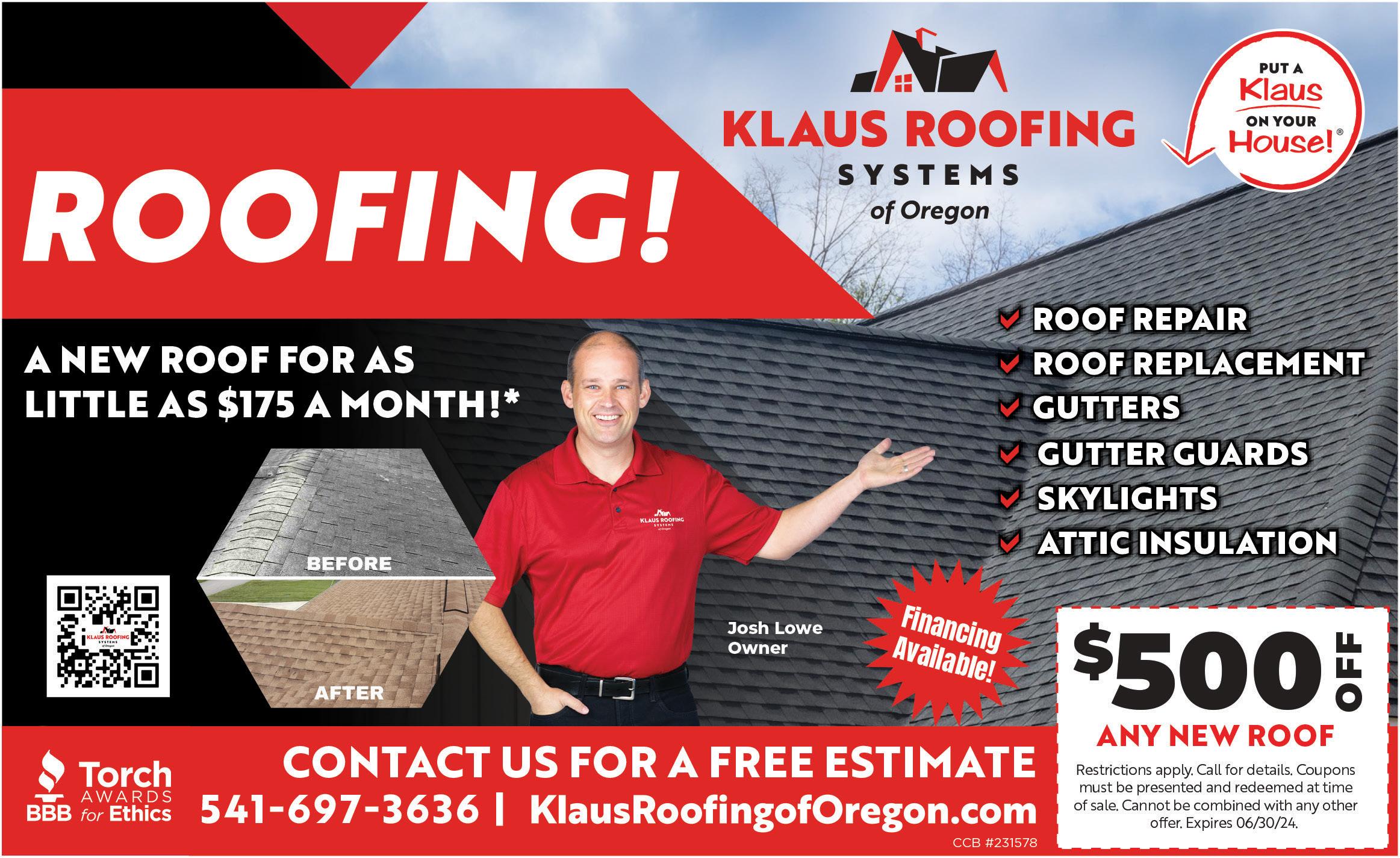 Josh Lowe O WNE R Before After $ 200 AN Y AIR SEAL ING & I NSU LATIO N PACK AGE Cannot be combined with any other offer. Not valid for prior work, must be presented and redeemed at time of estimate. Expires 06/30/24 OF F Quit wasting your money every month and making your home uncomfortable. It’s what’s underneath that makes your whole house WARMER in Winter & COOLER in Summer. Insulate your Attic C ON TACT US FO R A FRE E E ST IM ATE 541-697-3600 EnergySaverOregon.com CCB #176741 Financing Available! • Attic & Crawlspace Insulation • Spray Foam • Crawl Space Waterproofing 503 - 744 - 5004 CONTACT US FOR A FREE ESTIMATE 503-678-9415 | KlausRoofingofOregon.com READ MORE AT CITYHANDSHAKE.COM R3