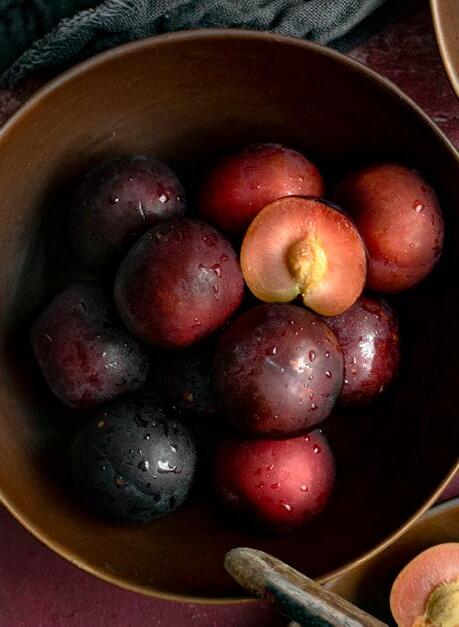 Pour the honey onto a plate and then dip each plum, cut-side down, into the honey to coat the surface.