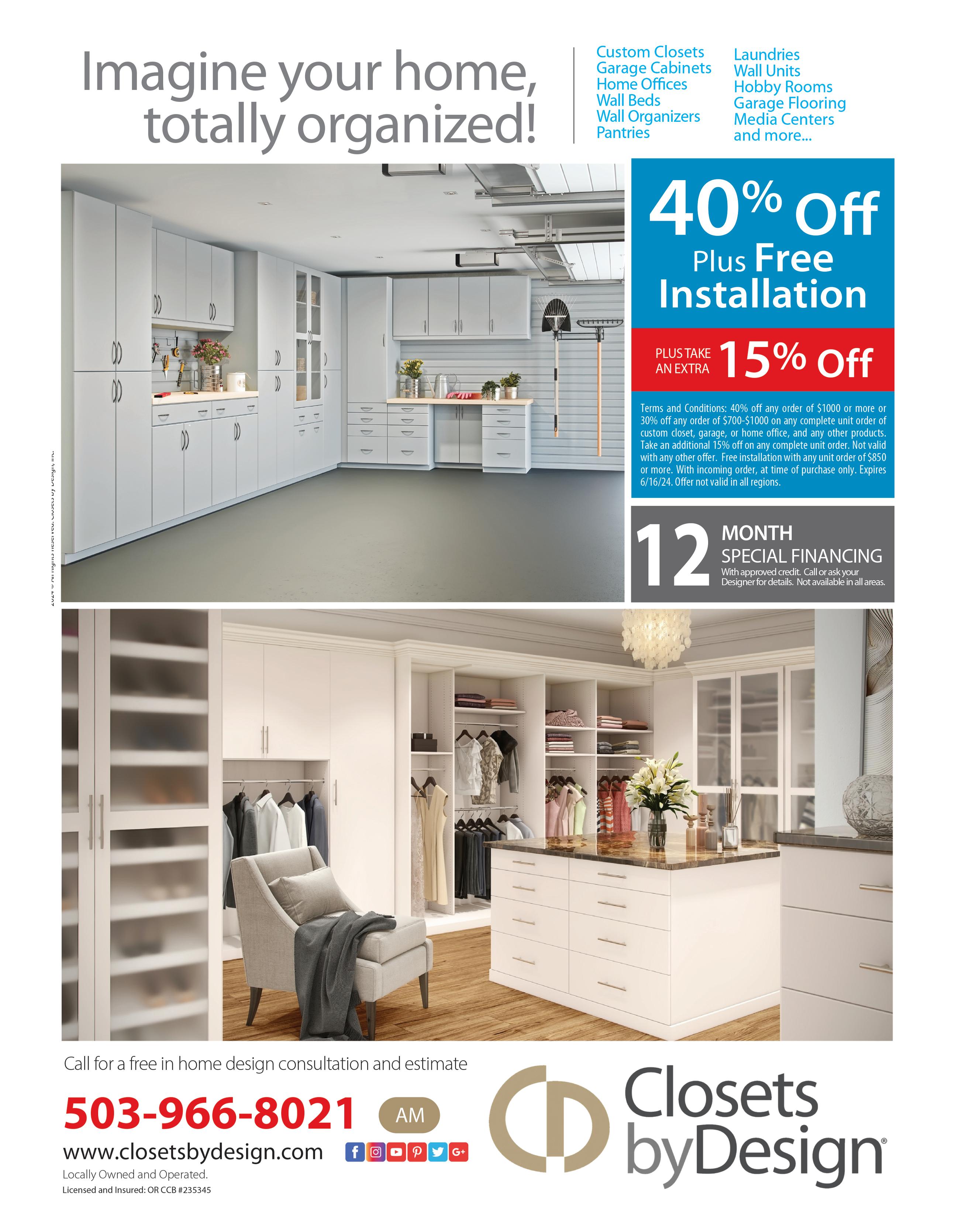For specials and promotions or additional information, visit your local Closets by Design website at portland.closetsbydesign.com or call (503) 966-8021.