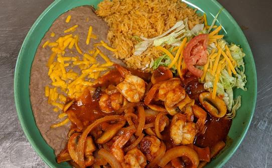 tostadas. Classic seafood, chicken, pork dishes, and house specials like Molcajete and Chile Colorado are also excellent choices. A few American options and a children’s menu for the little ones are available. Enjoy a complimentary dessert on the house, or choose from creamy Homemade Flan, delectable Fried Ice Cream, or crispy Sopapillas.
