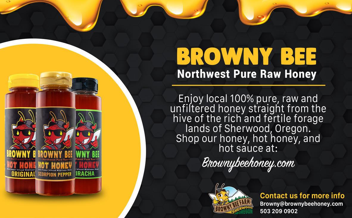 Browny Bee Honey invites you to “enjoy Local Hive, 100% pure, raw and unfiltered honey straight from the hive of the rich and fertile forage lands of the Northwest.” And shares that “the taste of our Northwest Raw honey is just as rich, with an earthy character, mellow sweetness and a variety of floral and berry notes.” Browny Bee Honey’s many varieties of unique raw honeys are produced “right in your own backyard” on a small farm in the Sherwood area. There are so many reasons to enjoy Browny Bee Honey. It’s a healthy food full of nutrients which include vitamins, minerals, antioxidants, amino acids, enzymes and bee pollen. It also makes a great natural sweetener that can be easily substituted for sugar in baking, tea and coffee.
