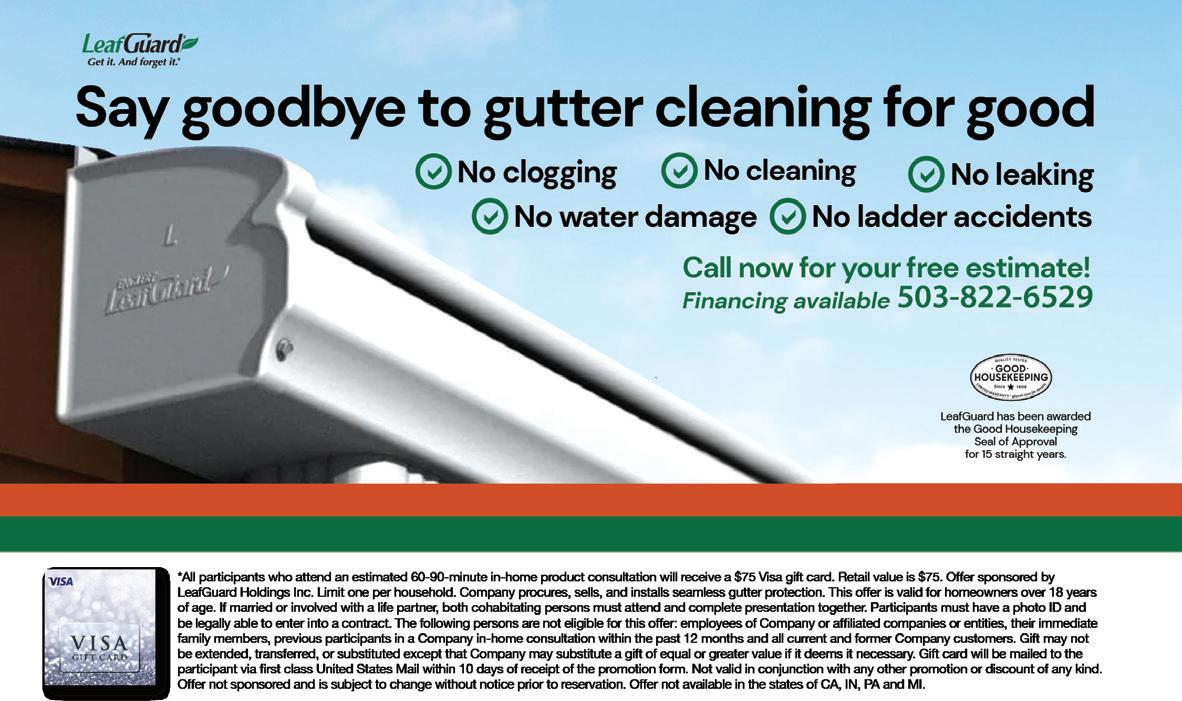 20% OFF if you call 503-822-6529 and set an appointment TODAY! Expires 4/15/23 +$100 Visa Gift Card! 14 colors to choose from, 1 day installation, GUARANTEED FOR LIFE! CALL NOW FOR AN ESTIMATE 503-442-6996 thepaintingcrewpdx.com 10% OFF ANY SERVICE Must present discount at time of estimate. Not valid with any other offers or discounts. SERVICES WE OFFER Pressure Washing Exterior Painting & Staining Interior Painting & Staining Cabinet Painting THE PAINTING CREW Residential & Commercial Licensed, Bonded & Insured • CCB# 230038 Visit CommunityAdvantageMagazines.com 29