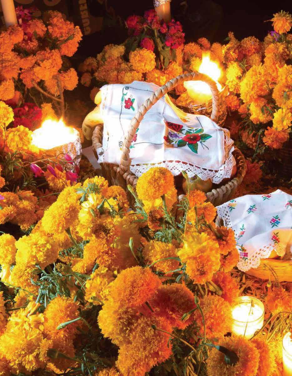 Central to the Day of the Dead is the belief that, once a year, the departed souls of loved ones return to the world of the living for a reunion with their families. These souls, whether they be the spirits of honored ancestors or beloved pets, are welcomed back with offerings of their favorite foods, drinks and mementos from their lives. Families construct ofrendas, or altars, decorated with candles, photographs and colorful papel picado — ornate paper cut-outs that flutter in the breeze. With its bright orange petals, the marigold, or cempasúchil, is everywhere, its sweet fragrance serving as a guide to draw the spirits home.