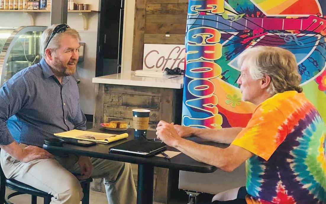 The Groove owner Eric Swenson (right) chats with a friend while enjoying a coffee.