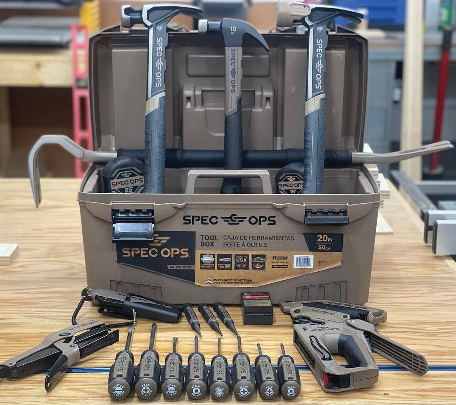 Spec Ops tools include: levels, hammers, tape measures, pry bars, screwdrivers, knives, nut driver sets, tool sets, chisels, nail sets, fastening tools, work lights, headlamps, and merchandise.