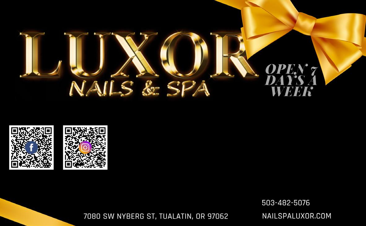 25% OFF ALL SERVICES Please present or mention coupon to receive offers. Expires 12/15/23 LUXOR NAILS & SPA 25% OFF ALL SERVICES 8499 Main St. • Wilsonville • 503-682-9673 • wankerscorner.com COME & JOIN US FOR A MEAL KIDS WELCOME UNTIL 9PM Carnitas Burrito ONLY $7 Served with fresh tortilla chips and your choice of hot or mild salsa Sunday-Thursday 11am-4pm Must present coupon. Not valid with any other offers. NOT VALID FOR HAPPY HOUR MENU OR TAKEOUT. Expires 12/15/23 $10 OFF Any Purchase of $60 or more Valid All Day Sunday-Thursday Must present coupon. Not valid with any other offers. NOT VALID FOR HAPPY HOUR MENU OR TAKEOUT. Expires 12/15/23 8 TO ADVERTISE WITH US, CALL 503.825.2111