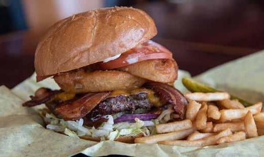 cocktail you’re craving. Wines are also sourced locally. With eight updated big-screen TVs that always show the day’s sporting events, a long, fully-stocked bar top and a private video poker room, it’s the ideal place to relax and watch a game. There are plenty of booths and tables for groups, so come with friends or bring the whole family; a kid’s menu is available for little ones. For a quieter dining experience, enjoy the full patio with covered seating where friendly dogs are always welcome.