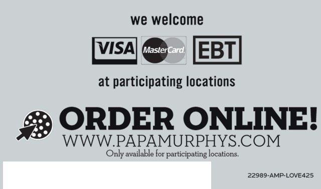 3 Any Pizza Any Size Any Stuffed Crust Pizza Any Large Pizza Any LargePizza Signature Pepperoni Pizza Choose Your Gourmet Delite® LARGE LARGE Fresh Pan In Large Only Includes Signature Gourmet Delite ®, Stuffed, Fresh Pan or Create Your Own up to 5 Classic Toppings. Additional Charge For Gourmet Toppings. Red Sauce & Premium Pepperoni Family Size $3 More Family Size $3 More Family Size $3 More 12 2 14 14 15 LSM03 LSM 03 LSM03 LSM03 LSM 03 LSM03 IN-STORE ONLY. Valid at participation location for a limited time. Not valid with other offers. Cannot be sold, transfered or duplicated. Limit 1. 924 AMP03717 IN-STORE ONLY Valid at participation location for a limited time. Not valid with other offers. Cannot be sold, transfered or duplicated. Limit 1. 937 AMP03717 IN-STORE ONLY. Valid at participation location for a limited time. Not valid with other offers. Cannot be sold, transfered or duplicated. Limit 1. AMP03716 IN-STORE ONLY Valid at participation location for a limited time. Not valid with other offers. Cannot be sold, transfered or duplicated. Limit 1. 1800 AMP03716 IN-STORE ONLY. Valid at participation location for a limited time. Not valid with other offers. Cannot be sold, transfered or duplicated. Limit 1. 964 AMP03716 IN-STORE ONLY. Discount off regular menu price. Excludes Mini Murph®, FAVE® and desserts. Valid at participation location for a limited time. Not valid with other offers. Cannot be sold, transfered or duplicated. Limit 1. 1662 AMP03716 WILSONVILLE 8269 SW Wilsonville Rd. 503-682-1793 Expires 06/15/23 Expires 06/15/23 Expires 06/15/23 Expires 06/15/23 Expires 06/15/23 Expires 06/15/23 Offering Get Your Hot Tub Summer Ready! PACIFIC HOT TUB SOLUTIONS SALES SERVICES SUPPLIES 0% Interest 6 MONTHS FINANCING (OAC) ON REPAIRS OVER $1000 Must present coupon. Expires 6/15/23 SPRING SPECIAL $50 OFF NEW HOT TUB COVER Must present coupon. Expires 6/15/23 13851 Beavercreek Rd., Oregon City • 503-913-2189 • pacifichottubsolutions.com Service, Repair, Supplies, PLUS Consignment & Reconditioned Hot Tubs and Swim Spas MAINTENANCE SPECIAL Visit CommunityAdvantageMagazines.com 7
