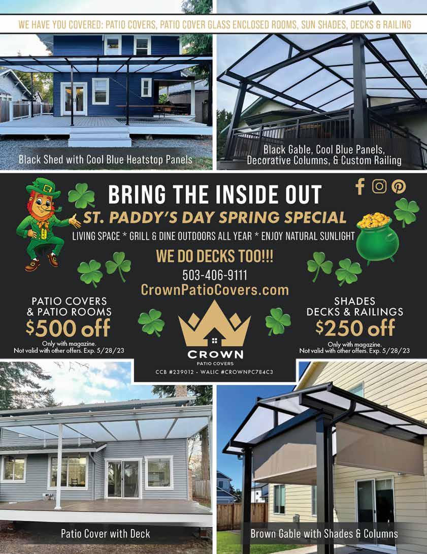 $1200 OFF NEW DECK Transform Your Outdoor Space Achieve Your Deck Dreams 503-664-7364 www.granddecks.com CCB #233423 Licensed, Bonded & Insured NEW DECKS RESURFACING PATIO COVERS FENCING $700 OFF DECK RESURFACING Must present coupon. Not valid with other offers. Exp. 5/15/23 Must present coupon. Not valid with other offers. Exp. 5/15/23 Financing Available 24 • WILSONVILLE LIVING MAGAZINE • MARCH 2023