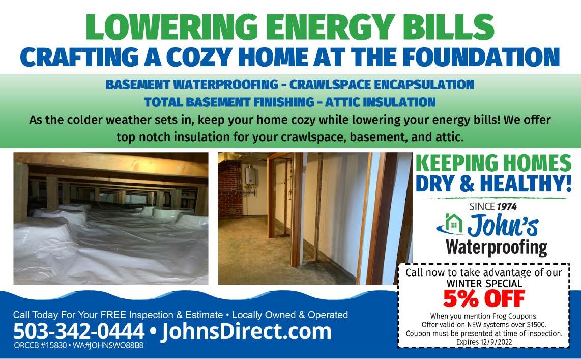 To schedule a free estimate from John’s Waterproofing, please call 503-342-0444. For more info on their services or to read reviews from satisfied customers, visit johnswaterproofing.com.