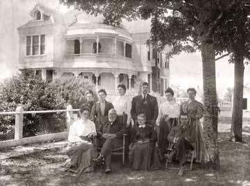 ABOVE: Jesse Holland Settlemier and family in front of the 1892 mansion. RIGHT: An antique postcard depicts a colorized photo of the house.