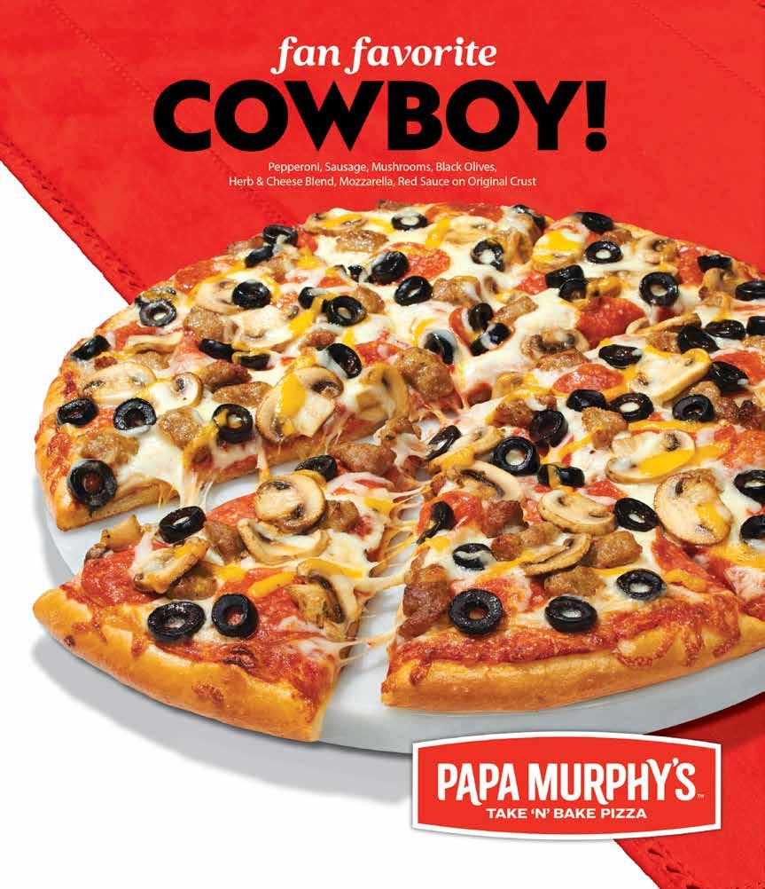 $3 off COWBOY PIZZA Discount off regular menu price. Pepperoni, Sausage, Mushrooms, Black Olives, Herb & Cheese Blend, Mozzarella, Red Sauce in Large or Family Size. ONLINE CODE: C6007 Not valid with any other offers, specials, promotions or discounts. Valid at participating locations. Cannot be sold, transferred or duplicated. Expires 1/31/2024 $4 off FAMILY SIZE PIZZA Discount off regular menu price. ONLINE CODE: C6016 Excludes XLNY®, Tuesday and Friday pizza deals.Not valid with any other offers, specials, promotions or discounts. Valid at participating locations. Cannot be sold, transferred or duplicated. Expires 1/31/2024 BOGO PIZZA SPECIAL 50% off PURCHASE A LARGE OR FAMILY SIZE PIZZA AT REGULAR MENU PRICE, GET A SECOND ONE OF EQUAL OR LESSER VALUE FOR HALF OFF ONLINE CODE: C6024 Excludes FAVES®, XLNY®, Tuesday and Friday pizza deals. Not valid with any other offers, specials, promotions or discounts. Valid at participating locations. Cannot be sold, transferred or duplicated. Expires 1/31/2024 $3 off THIN CRUST PIZZA Discount off regular menu price. Large or Family Size. ONLINE CODE: C6010 Excludes Tuesday and Friday pizza deals. Not valid with any other offers, specials, promotions or discounts. Valid at participating locations. Cannot be sold, transferred or duplicated. Expires 1/31/2024 WOODBURN • 1503 N Pacific Hwy • (503) 982-4532 Order at PapaMurphys.com