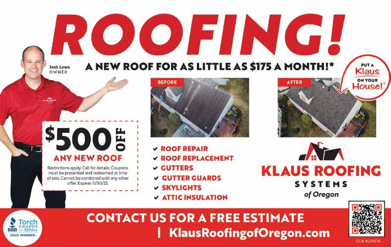 503-678-9415 | KlausRoofingofOregon.com CRAWL WE CAN ff v v v v 503 744 5004 | JLDrEnergySaver.com NASTY CRAWL SPACES? WE CAN ff EL rt v Humidity and water control v Keep insects, rodents and pests out v Smells and odors v Rising energy costs WATERPROOFINC Cannot be combined with any other offer. Not valid for prior work. Must be presented and redeemed at time of estimate. Expires 12/01/23. Jo"hLowe'" c[)r. ENERGY saver ® HOME SERVICES Wf FIX IINCOMfOKTADLf ff0Mf51 -· Josh Lowe OWNER READ MORE AT CITYHANDSHAKE.COM 51