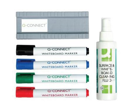 This whiteboard kit from Q-Connect contains a variety of cleaning products and accessories for use with your drywipe board. The kit contains a 125ml bottle of whiteboard cleaning fluid, a peelable eraser and four drywipe marker pens in assorted colours (black, blue, green and red).