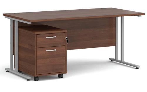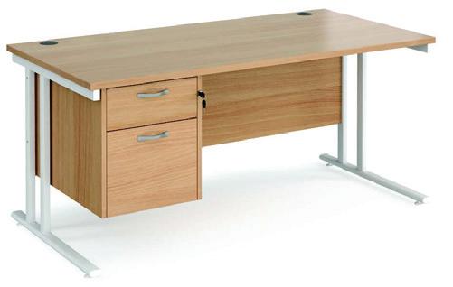 Rectangular desk with cantilever frame and two cable ports. Two drawer fixed pedestal that can be fitted to the left or right.