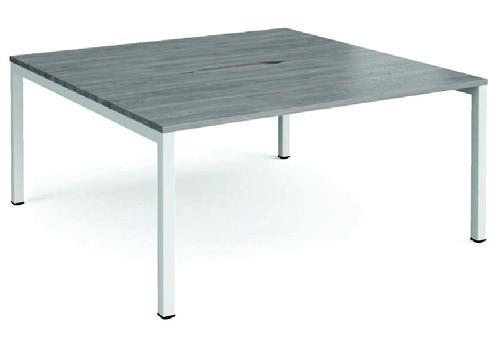 Four straight 800mm deep desks in a double back-to-back bench desk configuration. Legs are shared between desks, recessed centre leg support to save space and costs.