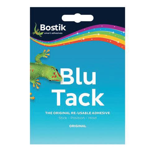 Supplied in 12 x 60g Handy Packs, Bostik Blu Tack is the original reusable adhesive. Apply it to almost any non-porous surface: painted walls, vinyl-coated wallpaper, glass or metal.