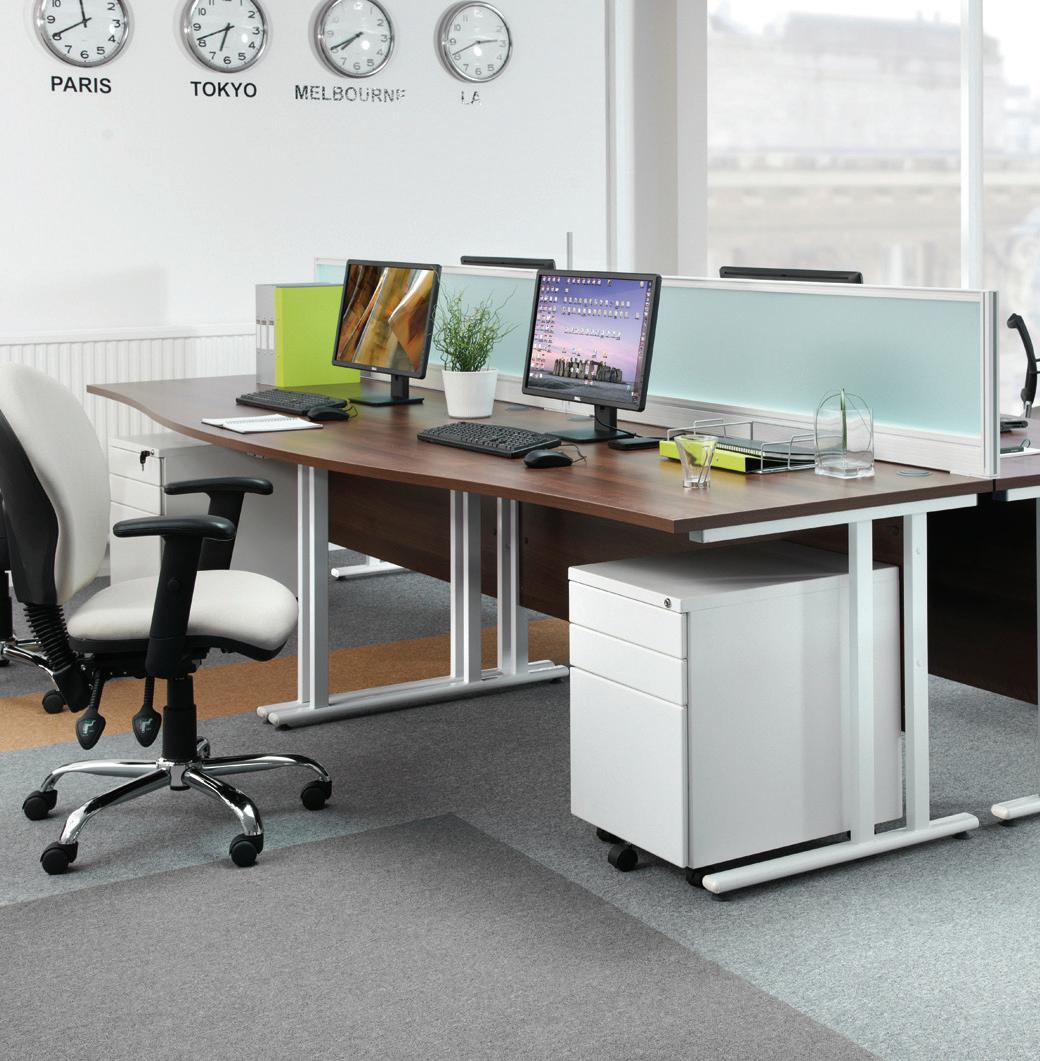 The welded double upright cantilever leg frame structure is powder coated for a stylish under frame and when combined with a 25mm melamine desktop ensures the strength and stability needed in commercial office furniture.