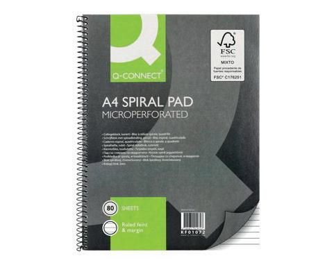 This Q-Connect executive spiral bound notebook features a rigid back board and 160 pages of 70gsm woodfree paper. The pages are feint ruled with a red margin for neat note-taking and perforated for easy removal from the pad. The pad is also four-hole punched for filing in standard lever arch files and ring binders.