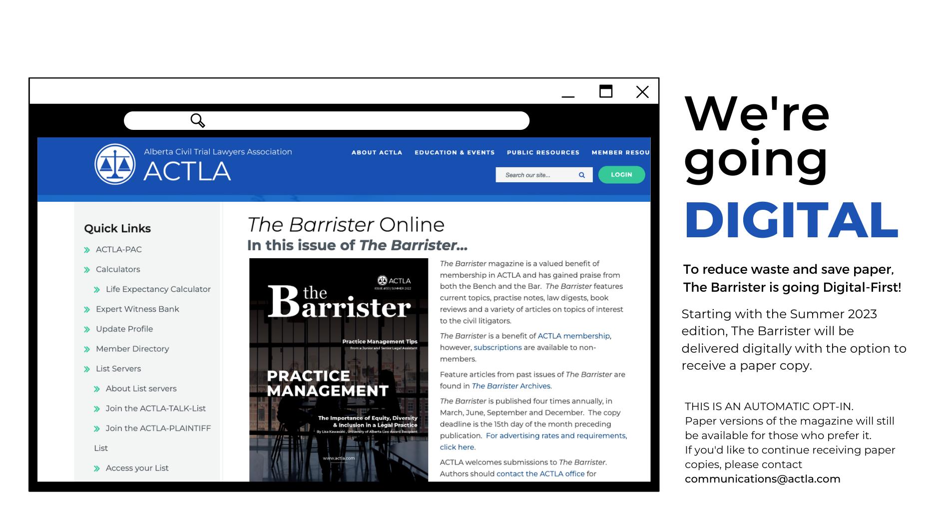 The Barrister is published quarterly by the Alberta Civil Trial Lawyers Association 777-10339 124 Street, Edmonton, AB, T5N 3W1 T: 780.429.1133 | 1.800.665.7248 | www.actla.com