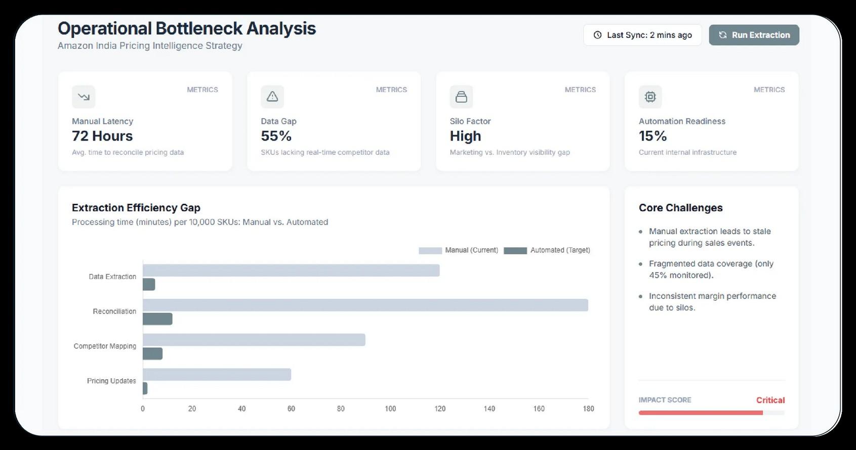 The primary bottleneck was the absence of automation to Extract Amazon India Pricing Data for Seller Insights efficiently. Manual spreadsheets created delays and inconsistencies across pricing teams. Data reconciliation often took days, making quick decisions impossible. Additionally, their internal systems lacked reliable Web Scraping E-commerce Website infrastructure capable of handling large SKU volumes. This led to partial data coverage, outdated price comparisons, and missed promotional windows.