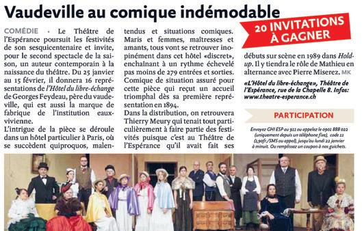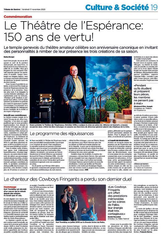 c’est le 15 février dernier que le Théâtre de l’Espérance a réuni ses amis pour partager une soirée festive avec une représentation exceptionnelle de «L’Hôtel du Libre-Échange» qui marquait nos 150 ans jour pour jour en présence du parrain de notre jubilé : Jean-Luc Bideau.