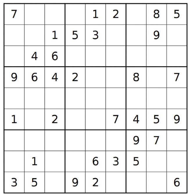 Le sudoku contient neuf lignes et neuf colonnes, soit 81 cases au total. Vous devez remplir les cases vides avec des chiffres de 1 à 9 en veillant toujours à ce qu'un même chiffre ne figure qu'une seule fois par colonne, une seule fois par ligne, et une seule fois par carré de neuf cases.