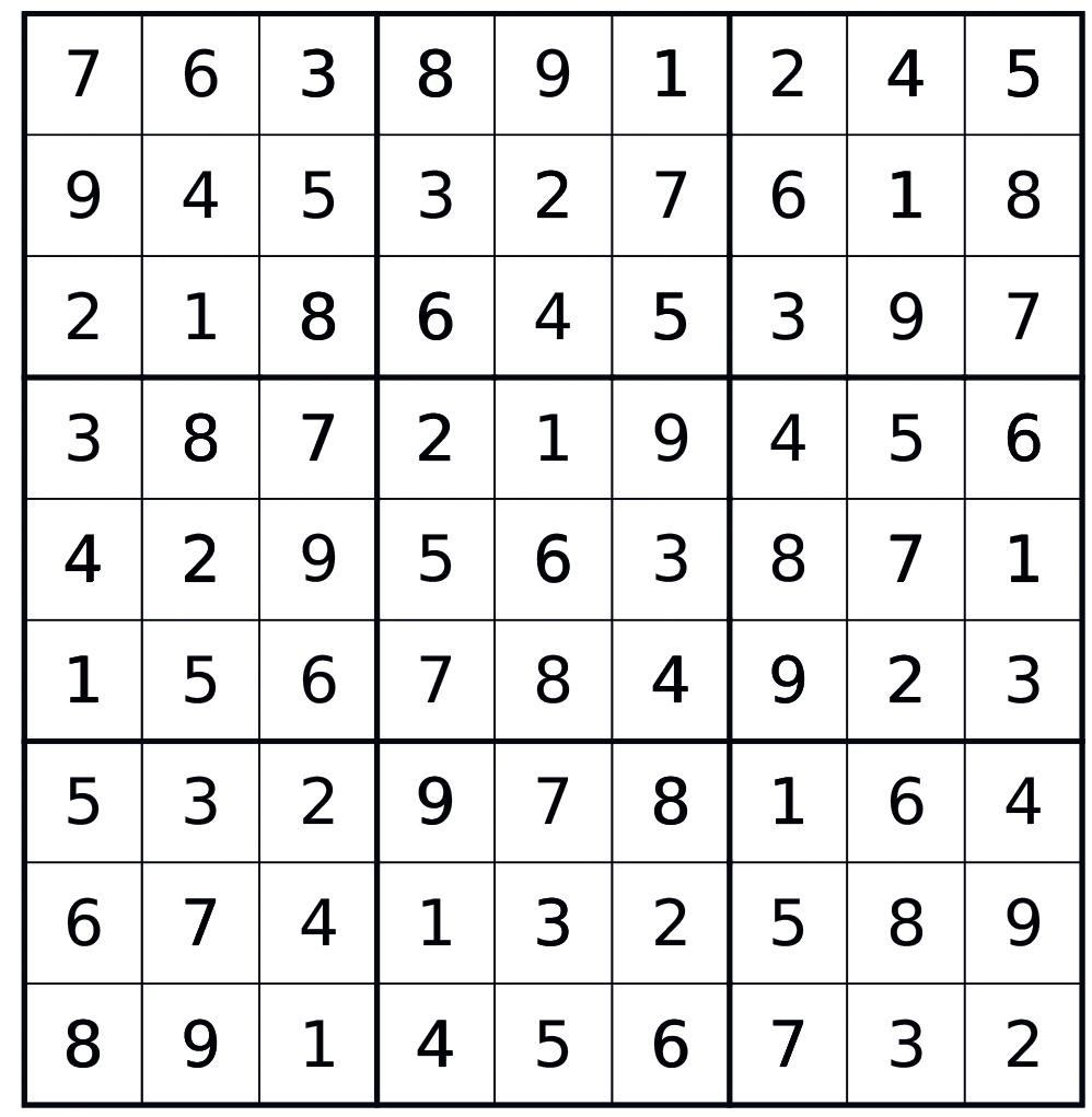 Le sudoku contient neuf lignes et neuf colonnes, soit 81 cases au total. Vous devez remplir les cases vides avec des chiffres de 1 à 9 en veillant toujours à ce qu'un même chiffre ne figure qu'une seule fois par colonne, une seule fois par ligne, et une seule fois par carré de neuf cases.