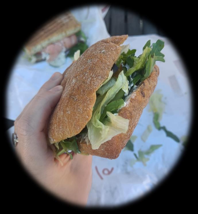 6 Lækkert brød Meget salat – hvor er auberginen? Kan også fås med laks Stor hånd? Eller lille sandwich? Redaktionen anmelder… Absolut udmærket sandwich. Mæt? Semi. Fattig? Nej – god pris. Hurtig betjening. Mange valgmuligheder. Kan anbefales!