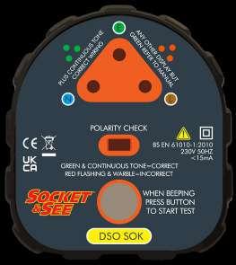 If a reverse polarity is detected it is indicated by a warbling tone and a red LED. If no polarity fault is present the SOK DSO will then act as a conventional socket tester.