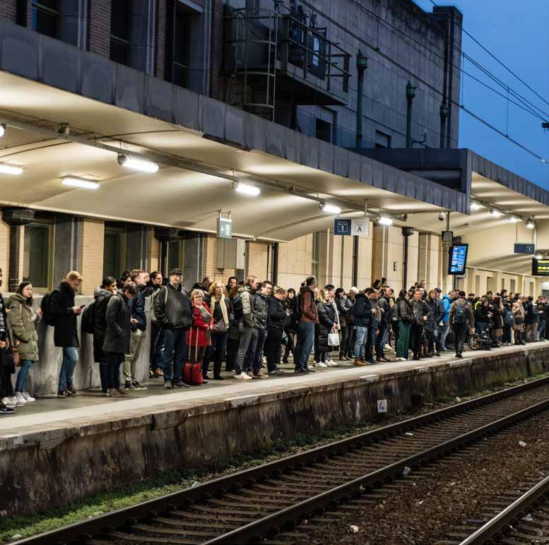 Pendelaars in afwachting van hun trein aan het Brusselse Noordstation. “Als je wil dat de trein de ruggengraat is van onze mobiliteit en aantrekke lijk voor de reiziger, dan moet veel meer dan nu geïnvesteerd worden in betere infrastructuur en personeel’, zegt Koen De Mey van Transcom. > Lees blz. 4-5