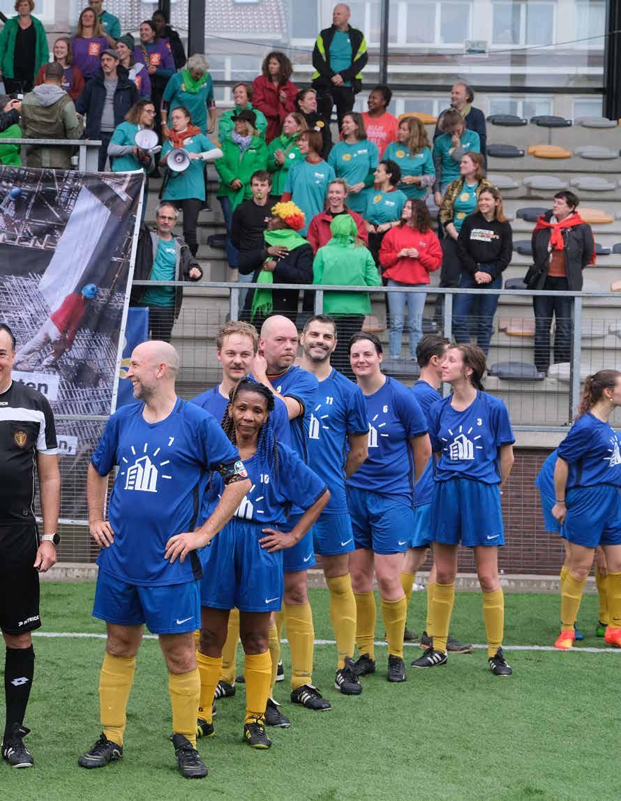 Wat zie je op de foto? Twee voetbalploegen in een voetbalstadion, een scheidsrechter met een wedstrijdbal, supporters met een tifo. Alle ingrediënten voor een onbezorgde pot voetbal. Maar… het is niet zomaar een wedstrijd.