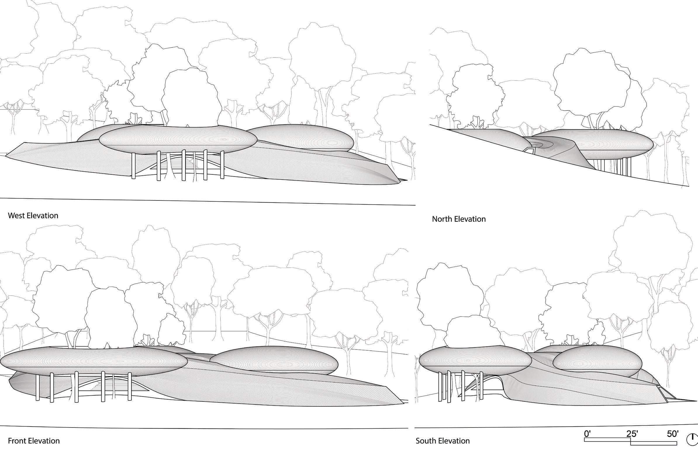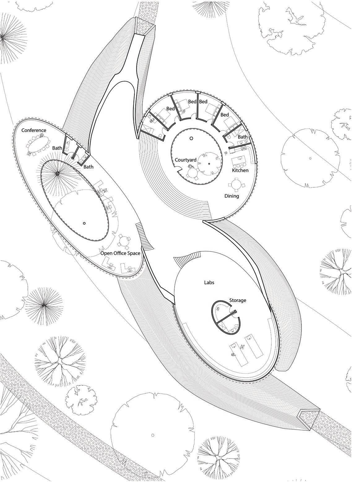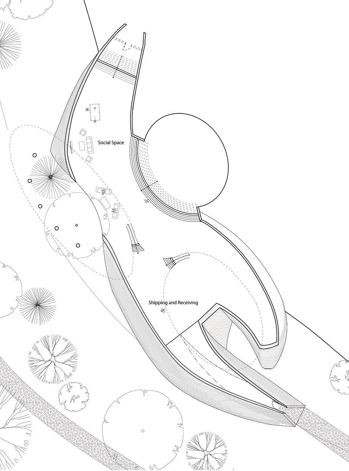 The culmination of second year fall studio is an ecological research outpost sited in Beacon, New York. For this project, our studio researched the site, the local biosphere, and speculated what would happen in the future were this site to be left to regrow without human interference. From this basis, research on landforms and elemental flows completed earlier in the semester was incorporated to create the basis of the center. This research defined the central section of the building, a large open, mixed use space that blends back into the natural landscape. The shaping of this lower section led to domed, programmed spaces, each of which explores a different relationship to the central section.