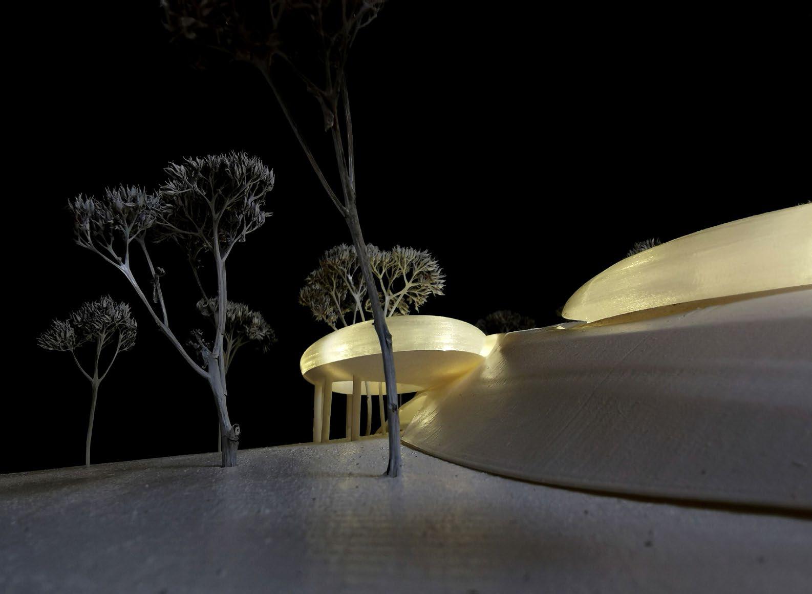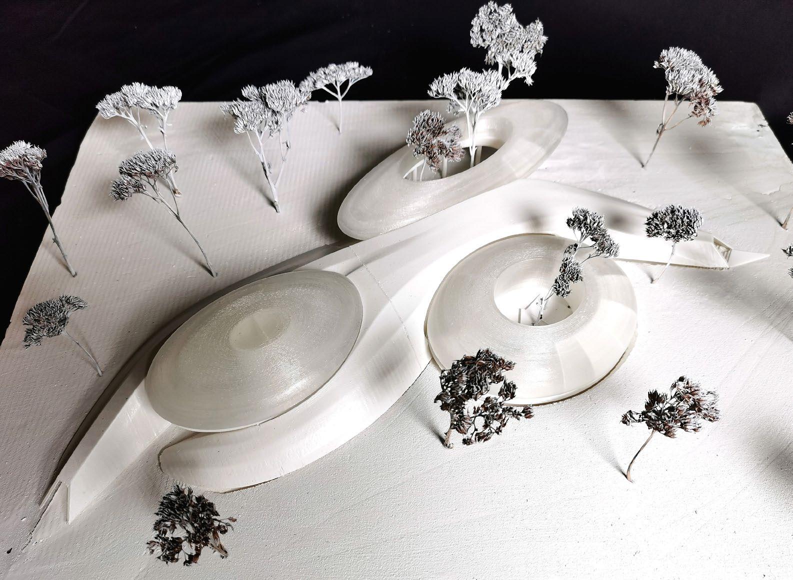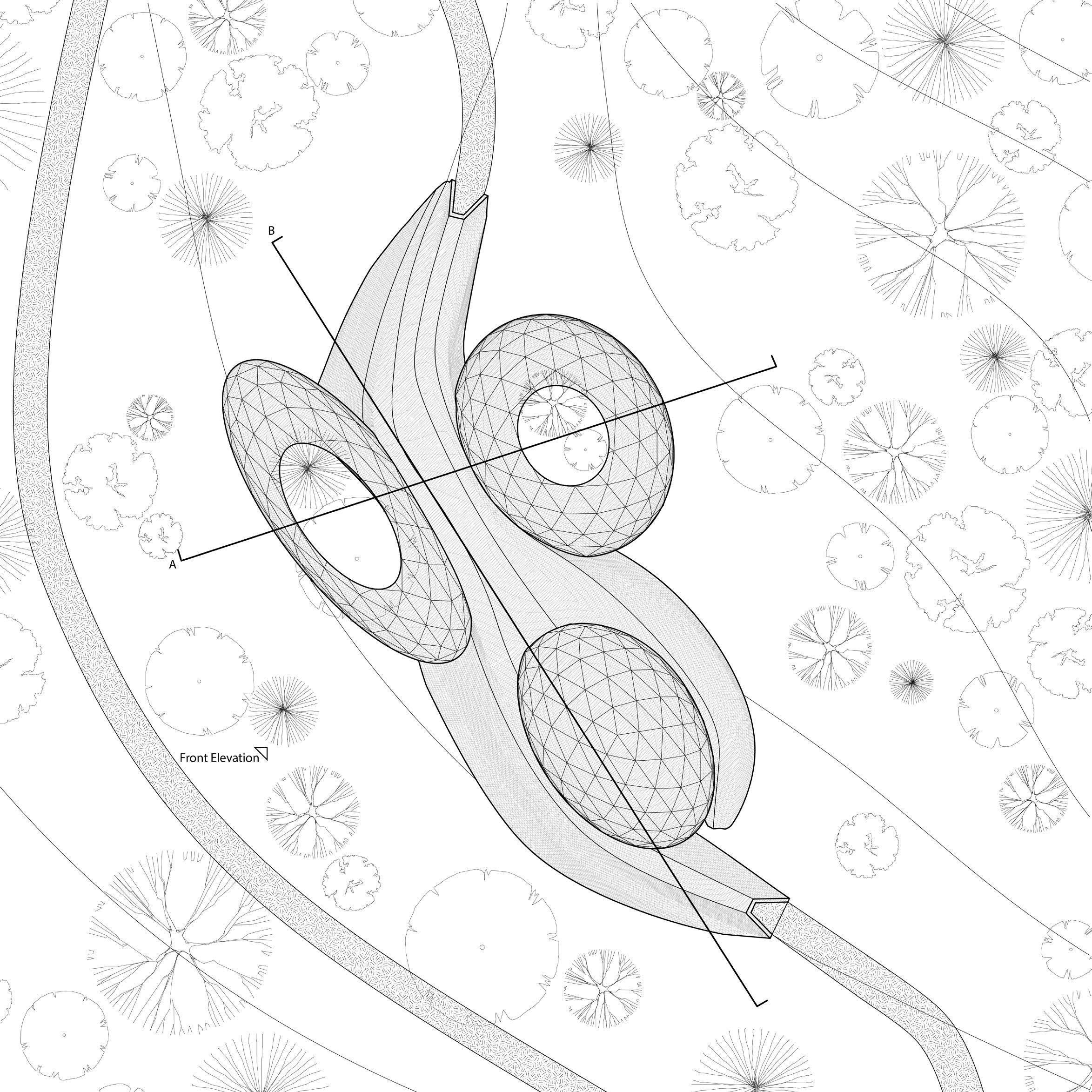 The culmination of second year fall studio is an ecological research outpost sited in Beacon, New York. For this project, our studio researched the site, the local biosphere, and speculated what would happen in the future were this site to be left to regrow without human interference. From this basis, research on landforms and elemental flows completed earlier in the semester was incorporated to create the basis of the center. This research defined the central section of the building, a large open, mixed use space that blends back into the natural landscape. The shaping of this lower section led to domed, programmed spaces, each of which explores a different relationship to the central section.