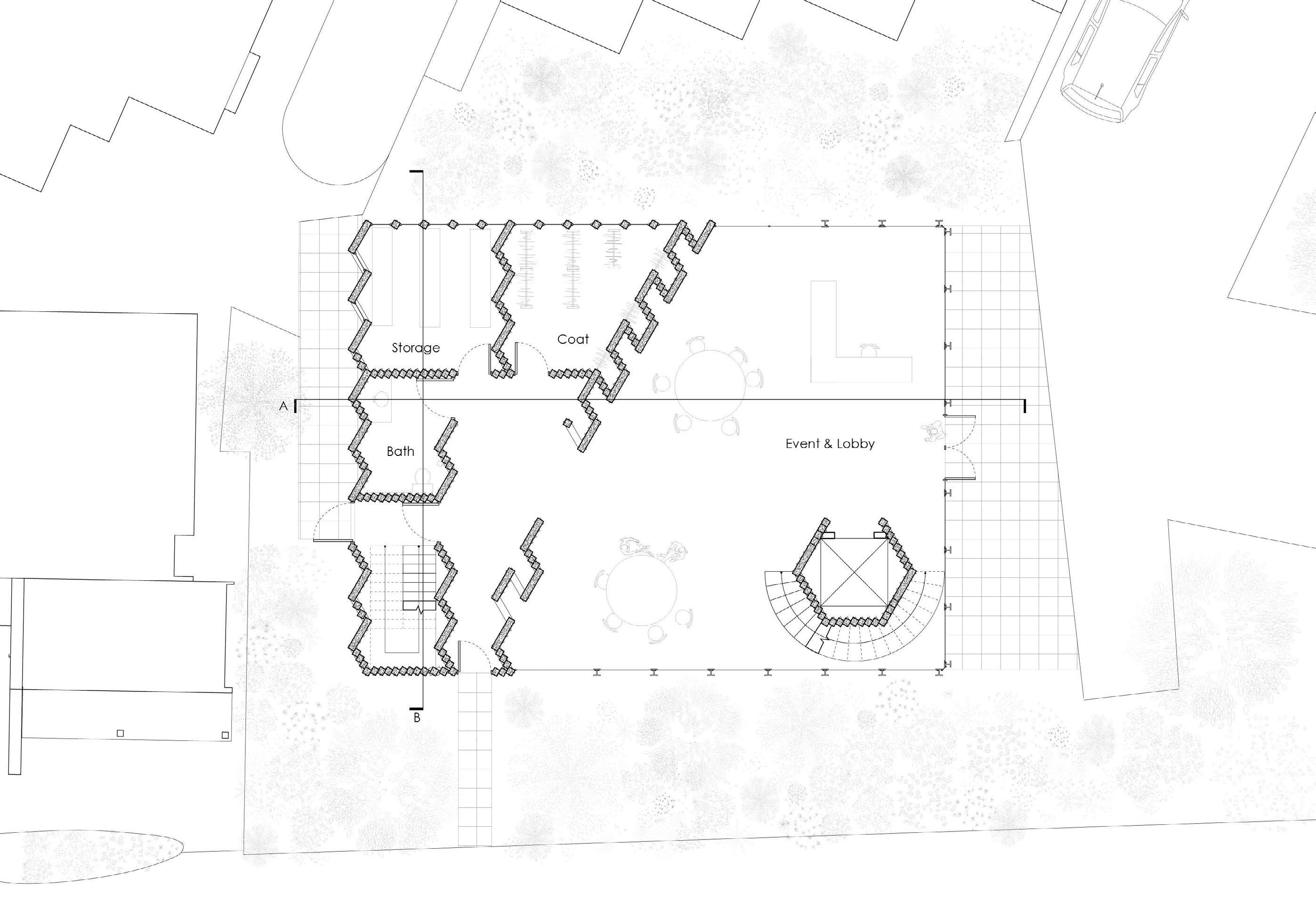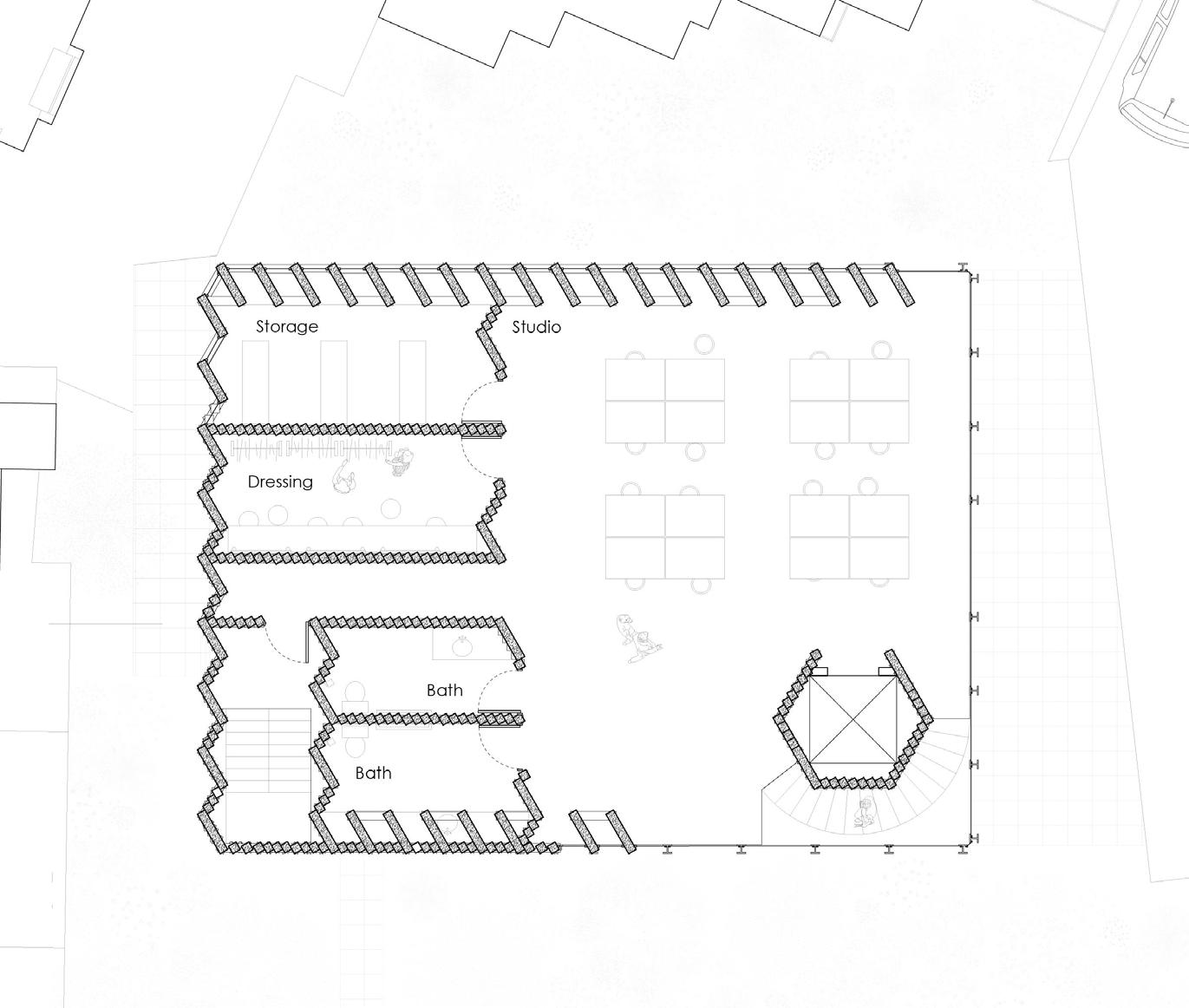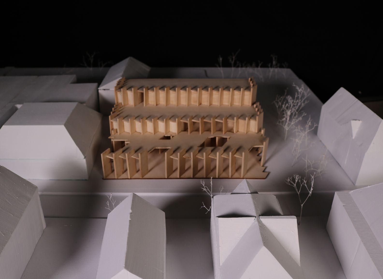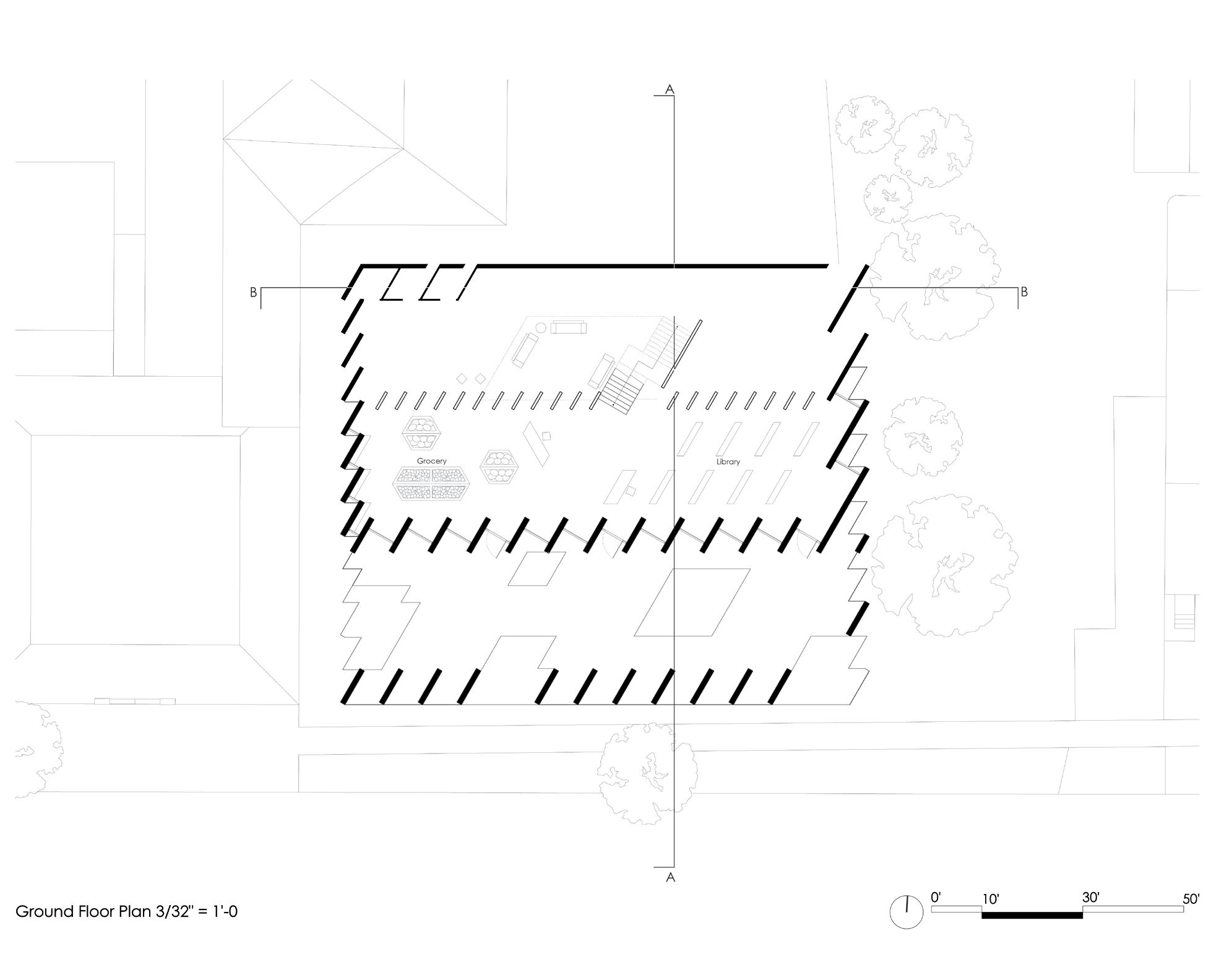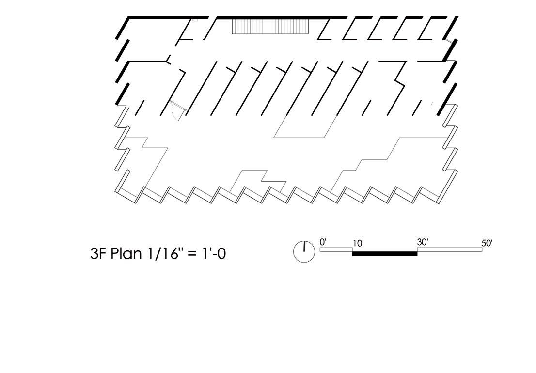 The final project of first year studio was a youth hostel for the Syracuse area. This design is set in a mixed use area, bordering a residential neighborhood and a commercial street. It is based on a triangular grid, angling the views from inside towards the social, public street and the views from the exterior towards the neighboring community garden space.