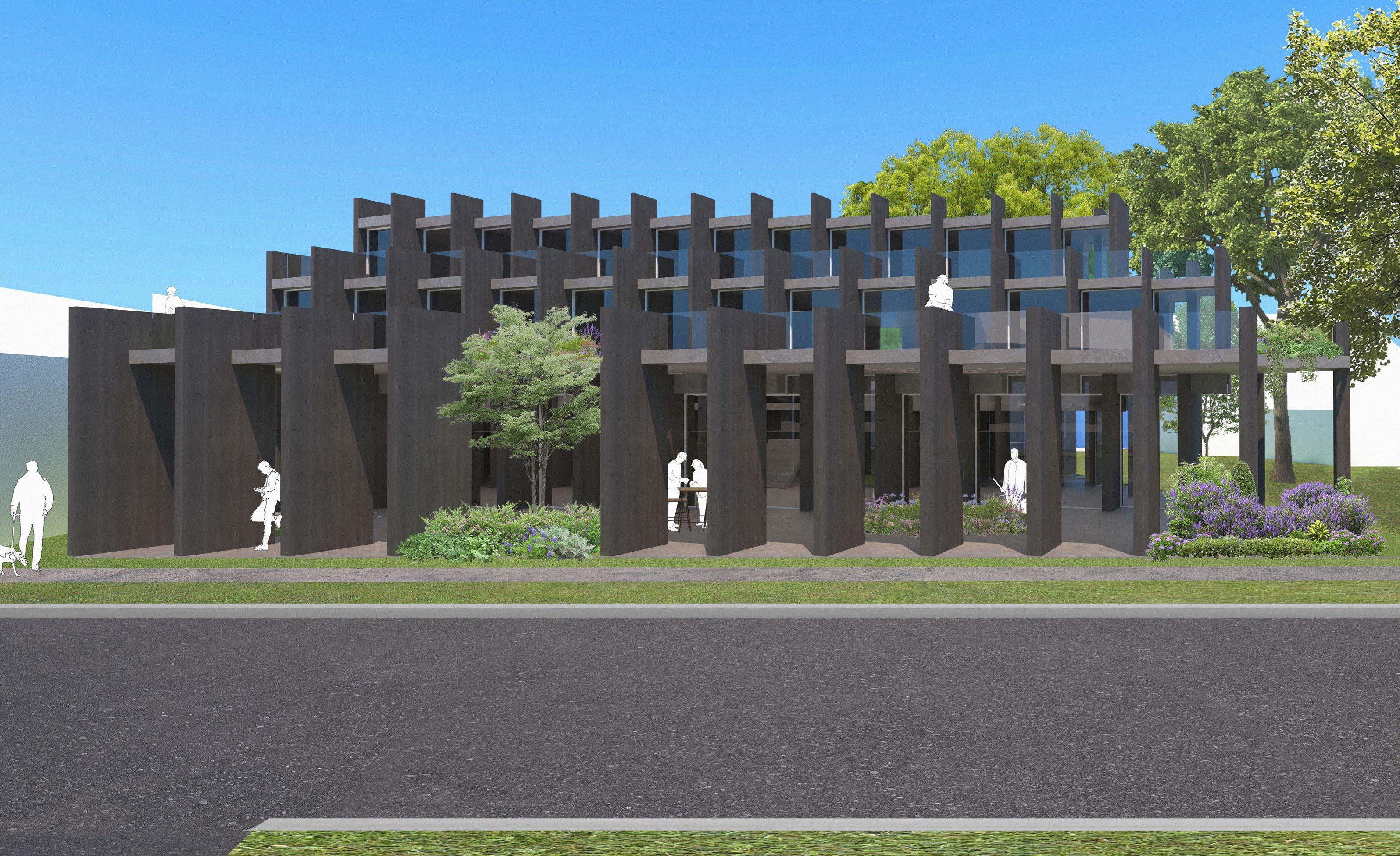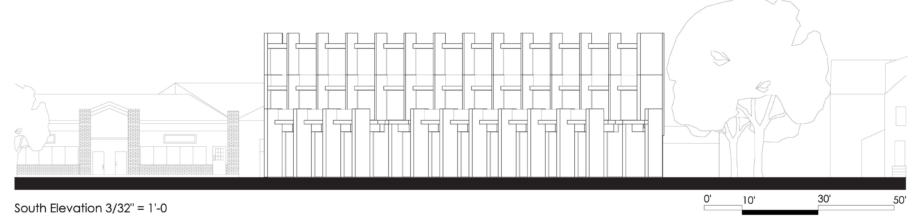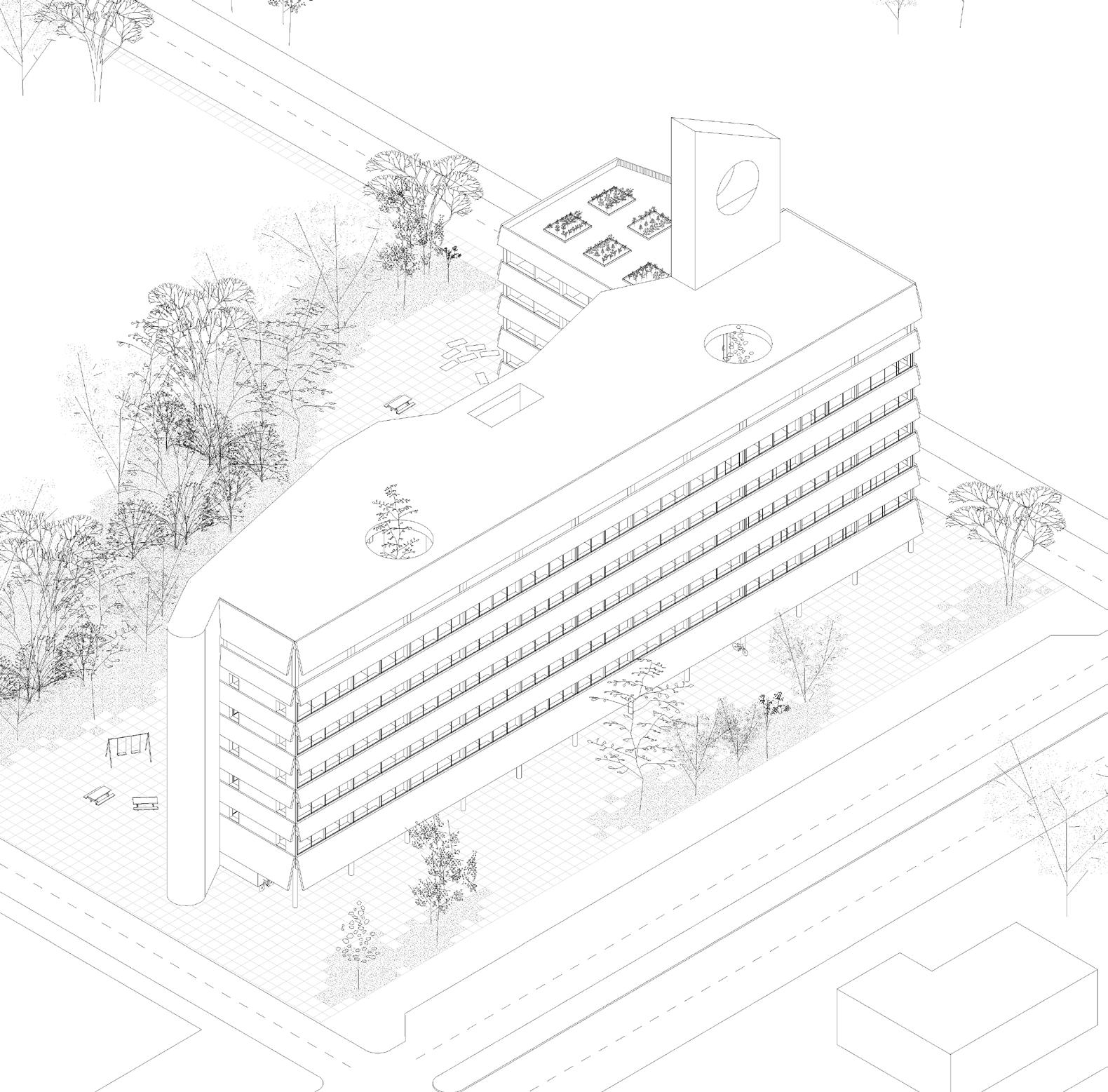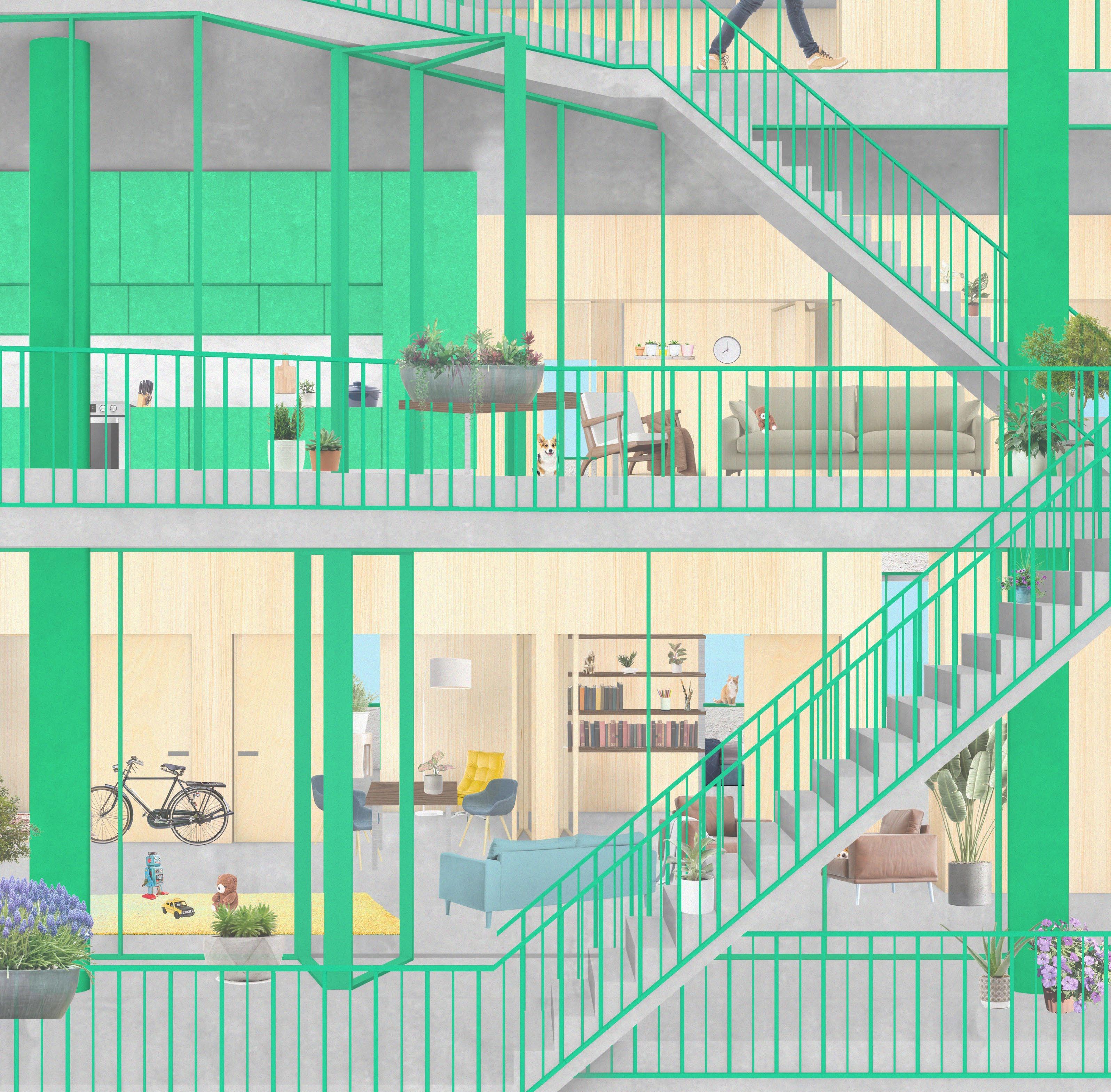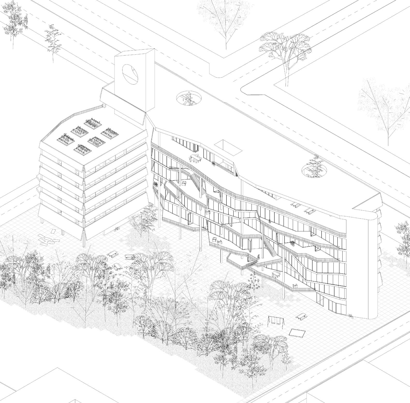 The large rear strip of space provides myriad opportunity for connection between groups of units, the floor as a whole, and the different levels through secondary vertical circulation and key spaces such as balconies and shared kitchens. The front facade presents a more typical appearance, reflecting the more rigid private areas within. The rear facade is much more detailed and dynamic, expressing the ever changing needs and happenings of the residents.
